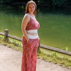 L’ensemble Pelia, c’est un patron deux-en-un qui conjugue confort, féminité et allure, composé d’un short ou pantalon trapèze à poches italiennes et d’un cropped top à bretelles spaghetti. La taille est maintenue par une large ceinture en bord-côte (minimum 40 % d’élasticité), garantissant un confort optimal. Le top est souligné sous la poitrine par une bande de bord-côte, avec un joli décolleté en V devant et un dos élastiqué. Il peut se porter avec un soutien-gorge.