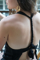 Il arrive juste au dessus des petites hanches. Il possède un décolleté goutte. Le dos est nu et vous laisse de nombreuses possibilités de laçage .