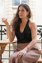 Le top Emma, dans un tissu à motifs, se mariera également parfaitement avec le short Brigitte en denim et des baskets pour un look estival.