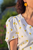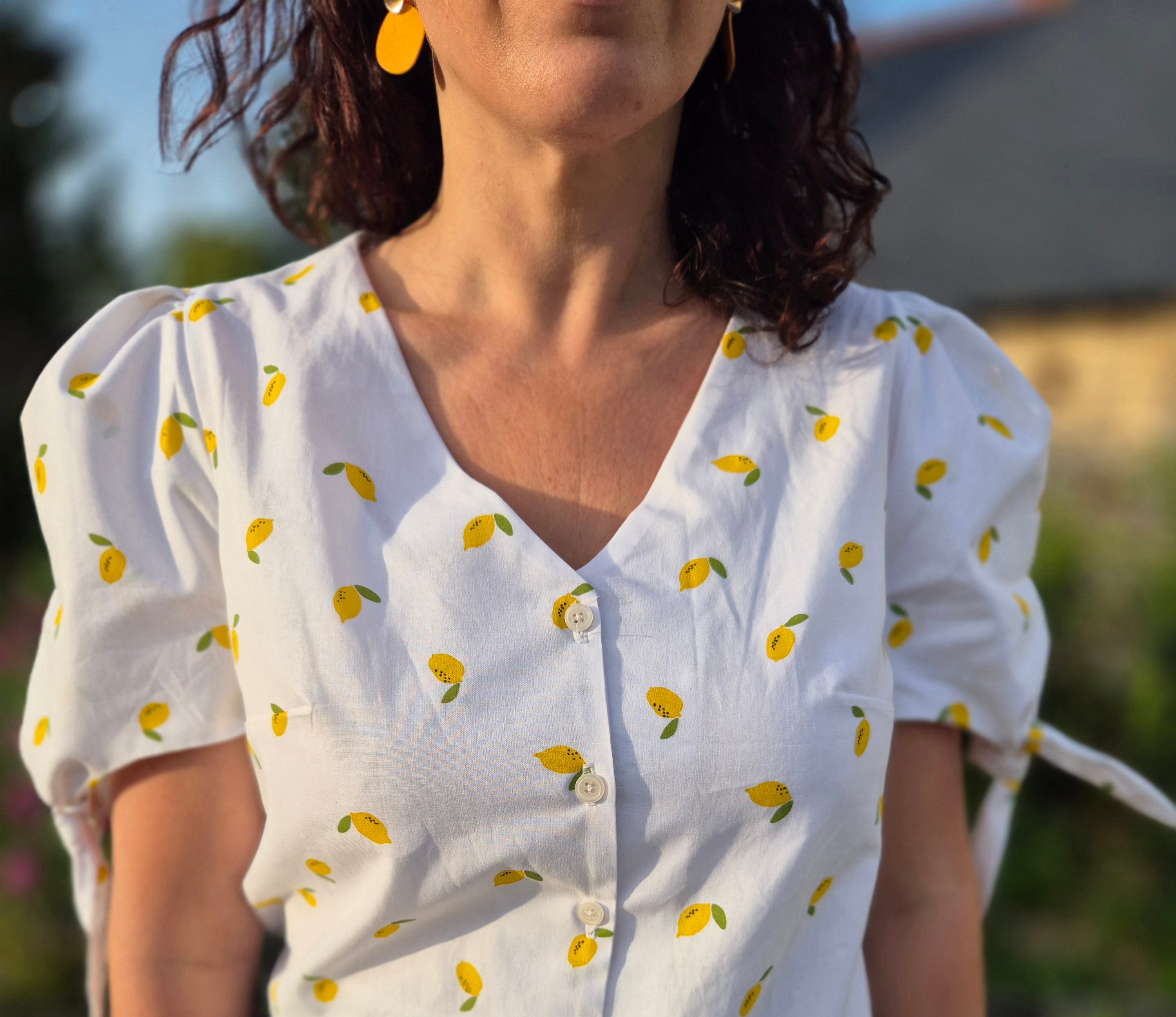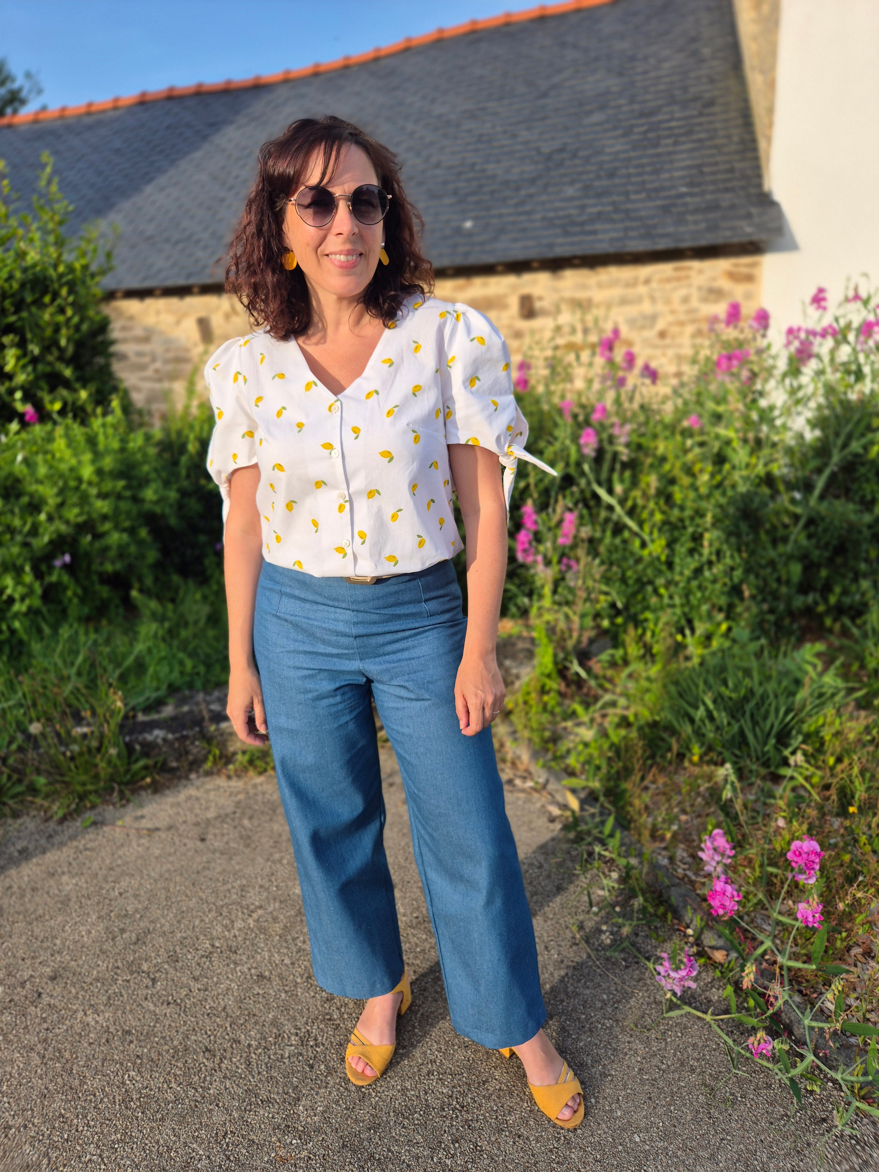 Le pantalon Fiteasy’m de Clématisse Pattern, cousu dans un denim clair, offre une coupe moderne et décontractée. Il est associé au chemisier Nina de Nine Patrons de Couture, réalisé dans une popeline de coton aux motifs citrons pour une note de fantaisie estivale.