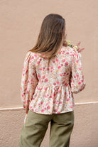 Cette blouse comporte des manches gigots longues avec des petites lacettes aux poignets pour venir ajuster le bas de la manche, des fronces sur la tête de manche. L’encolure d’Alessia est ornée d’un volant froncé.