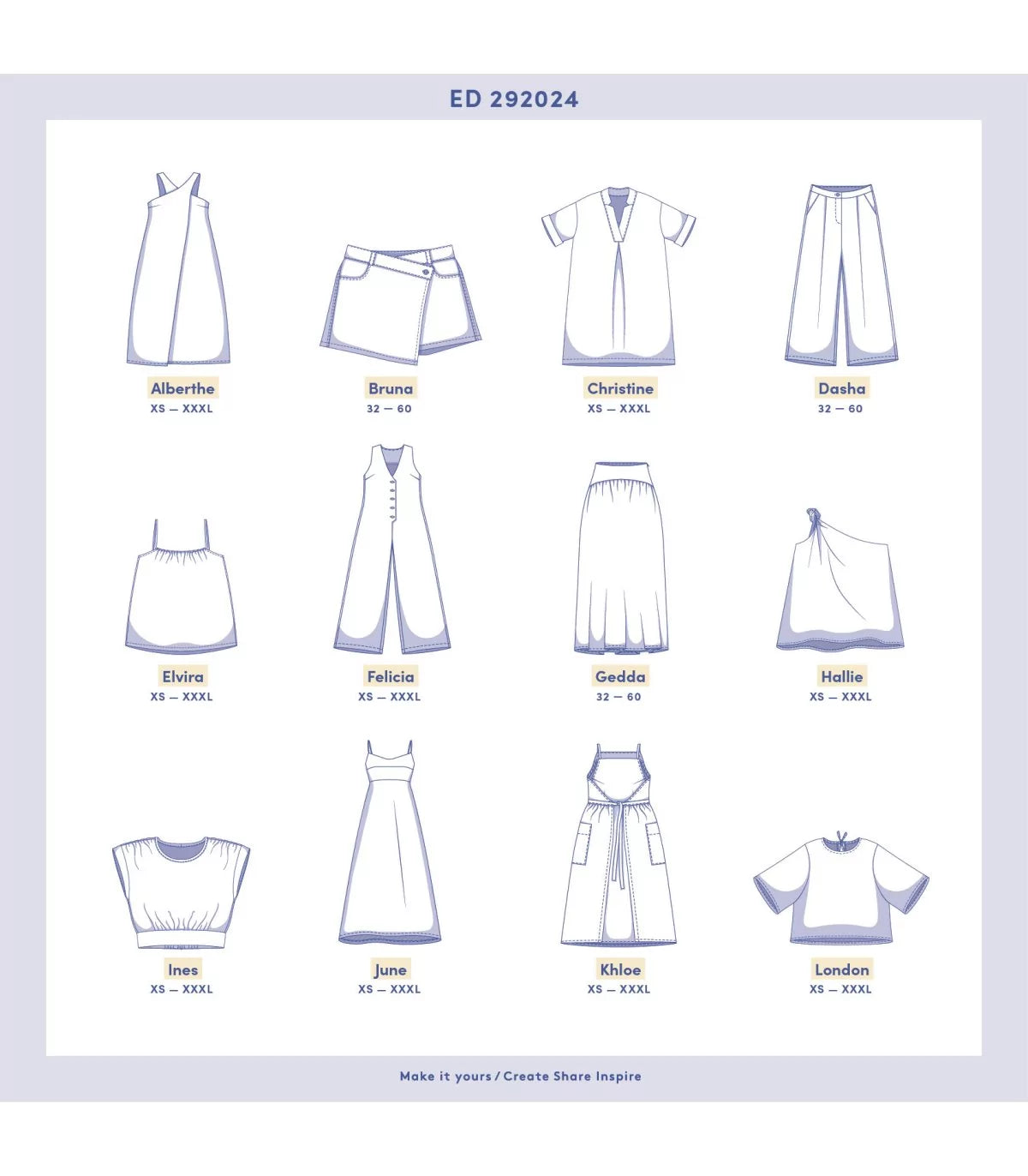 Alberthe, Christine, Félicia, June, Ines, Elvira, Dasha, Hallie, London : des robes et tops aux coupes variées, adaptées à différentes occasions estivales.